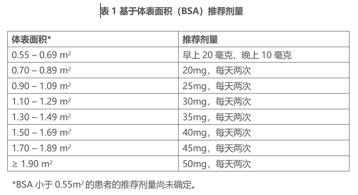 * 推荐剂量为25mg/m2,空腹口服,每日两次。每次服用前2小时或服药后1小时不要进食。
