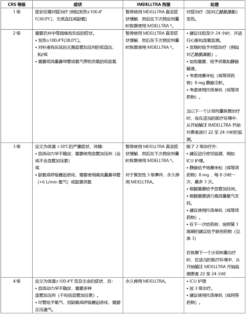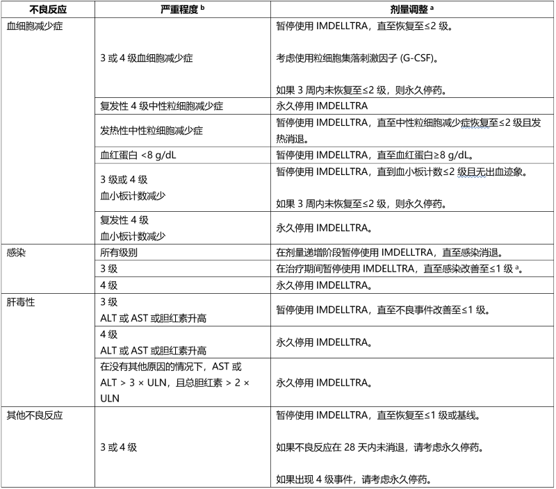 b 有关剂量延迟后重新开始使用 IMDELLTRA 的建议,请参阅表 4 。