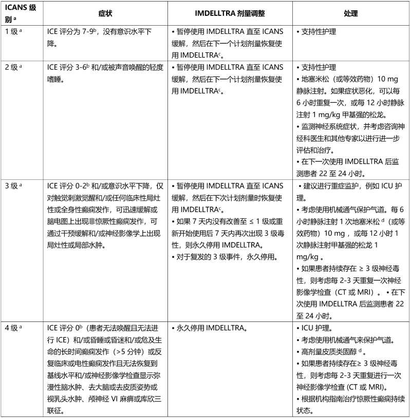 一出现神经毒性(包括 ICANS)症状,应暂停使用 IMDELLTRA 并考虑进行神经系统评估。排除引起神经系统症状的其他原因。对严重或危及生命的神经毒性(包括 ICANS)提供支持性治疗,可能包括重症监护。根据表 6 中的建议处理ICANS 和神经毒性,并考虑根据现行实践指南进行进一步处理。