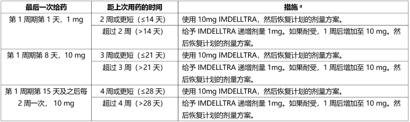 如果延迟使用 IMDELLTRA,请根据表 4 中的建议重新开始治疗,并相应地恢复用药计划。